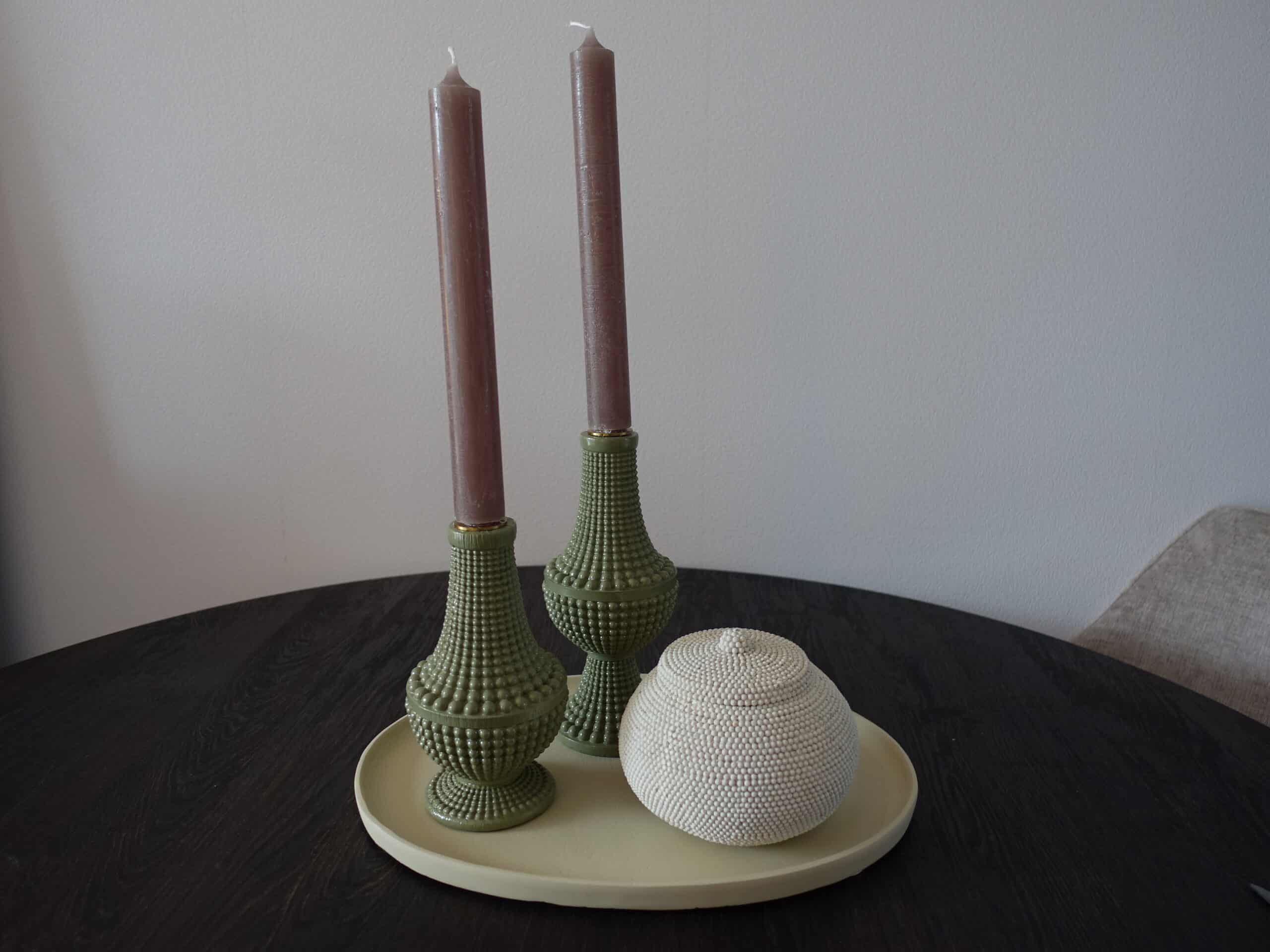 De groene kandelaar met kralen is een elegante blikvanger met een tijdloos design. De groene kleur geeft warmte en karakter aan ieder interieur. Door de twee verschillende maten zijn de kandelaars perfect met elkaar te combineren voor een speels effect op tafel, dressoir of vensterbank.