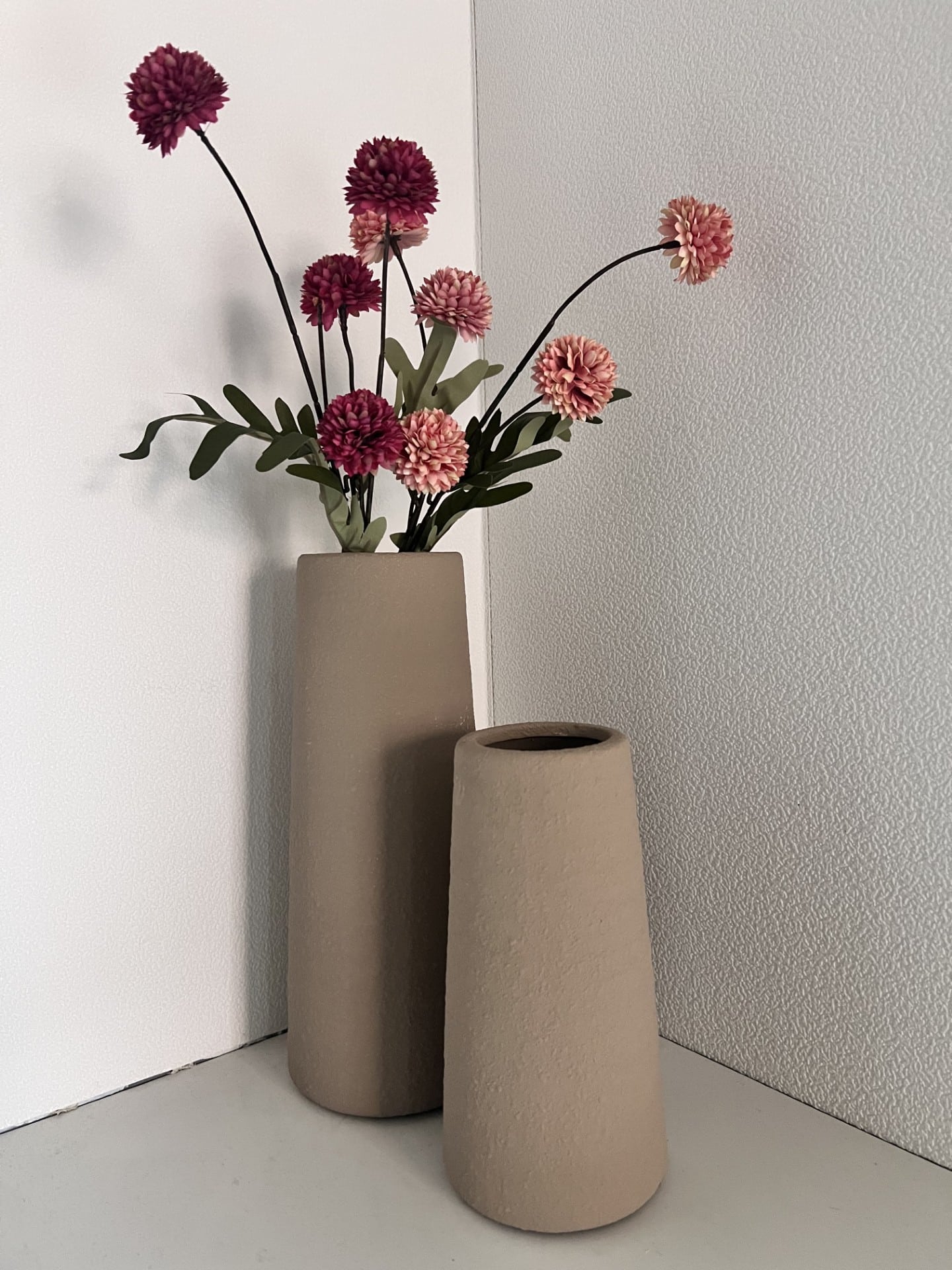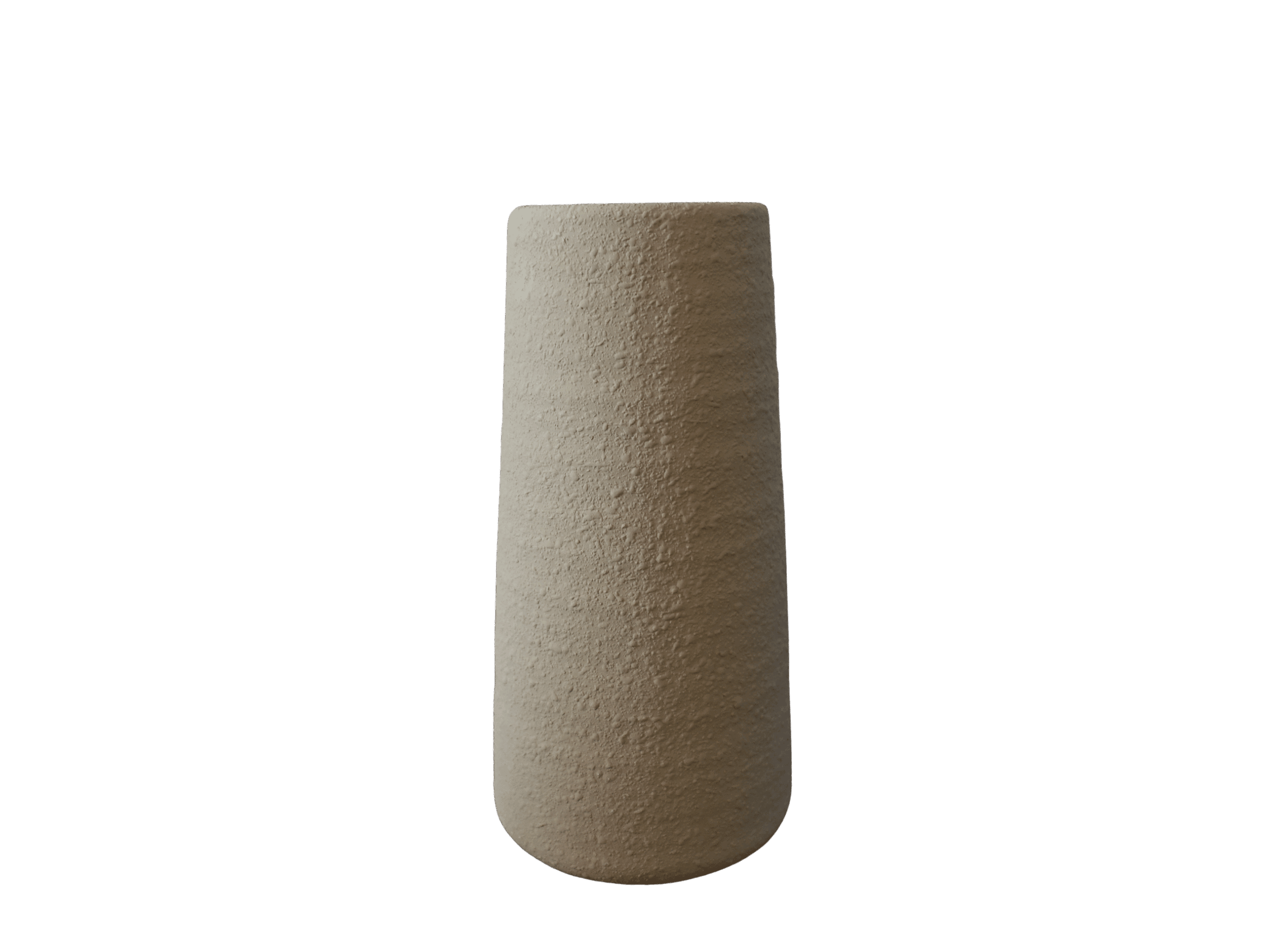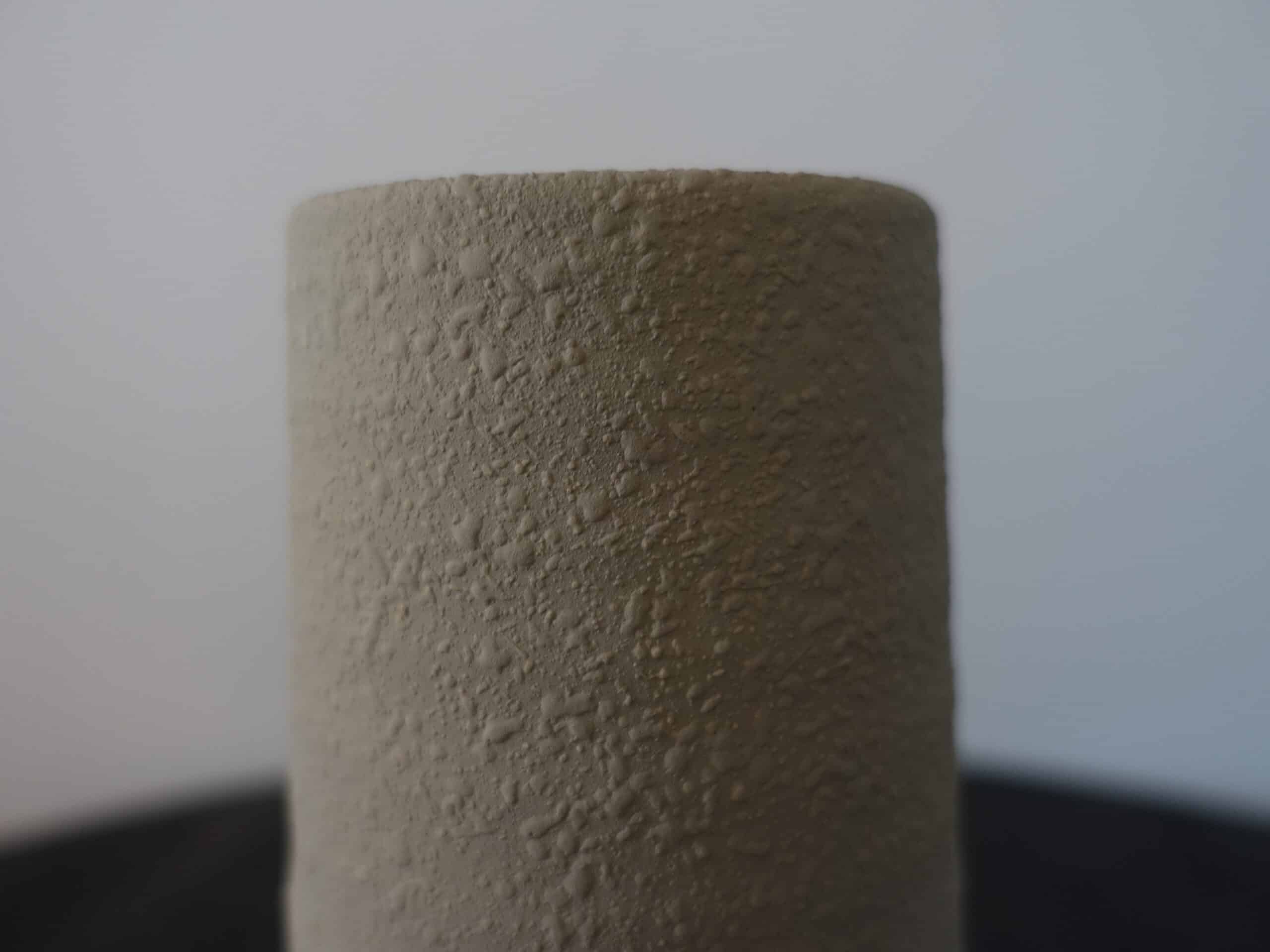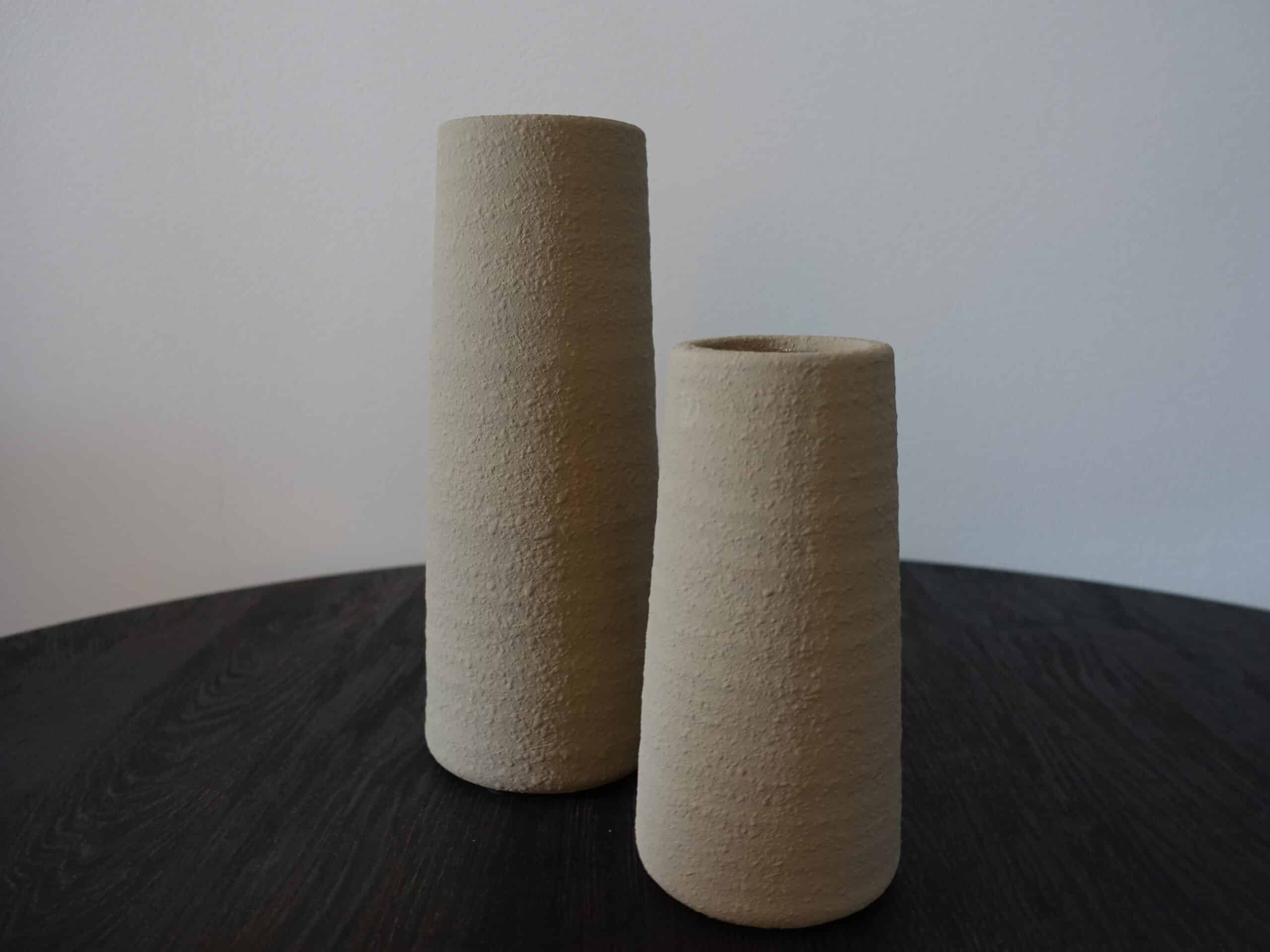 Cilindervormige vaas met een matte, licht ruwe structuur. De neutrale tint geeft een rustige, natuurlijke uitstraling. Mooi met takken, droogbloemen of als decoratief object. Verkrijgbaar in twee maten, perfect om te combineren.